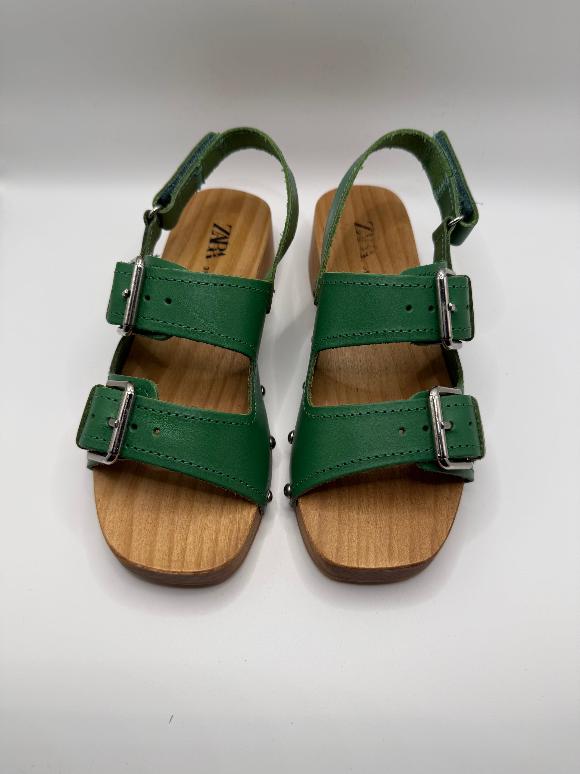 Green Zara sandals with wooden sole or heel.